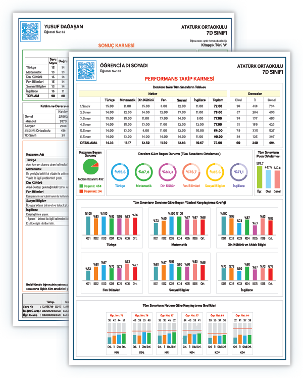Kurum içi sınavlarda her bir öğrencinizin performansını, ilerleme durumunu, eksik kazanımlarını detaylı karnelerle takip edin.